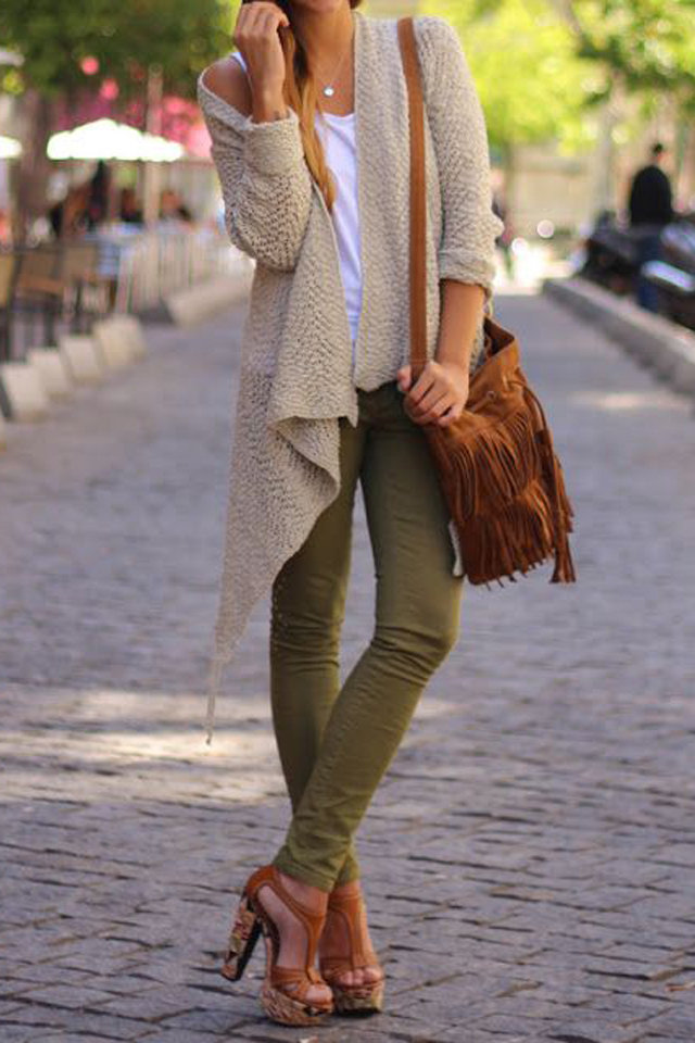 اعتمدي في إطلالتك هذا البنطلون باللون الزيتي المميز مع القمصان أو البلوزات ذات اللون الرمادي لإطلالة رسمية وأنيقة.