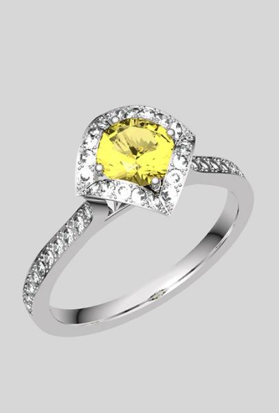 •      يجمع الخاتم المرصع بالالماس الاصفر مظهر الخاتم التقليدي مع الخاتم العصري الذي يتوسطه حجر ماسي صاف باللون الأصفر البراق في آن واحد.