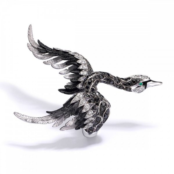 قدمت داماس صيحة جديدة من صحية المجوهرات في عالم الخواتم حيث صمممت خاتم على شكل طائر خيالي من الذهب الابيض وفوقه قطع من الماس الاسود
