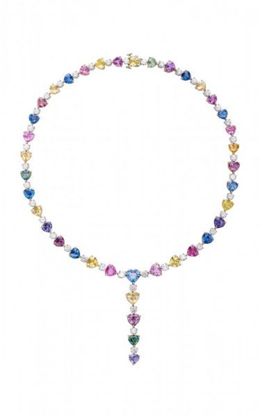 يتميز هذا العقد انه يتمتع بجاذبية خاصة بسبب الوانه الساحرة التي تتكون من بريق الاحجار الكريمة الملونة كاحجار الياقوت الملون على شكل قلب مع وجود الماس البرلنت