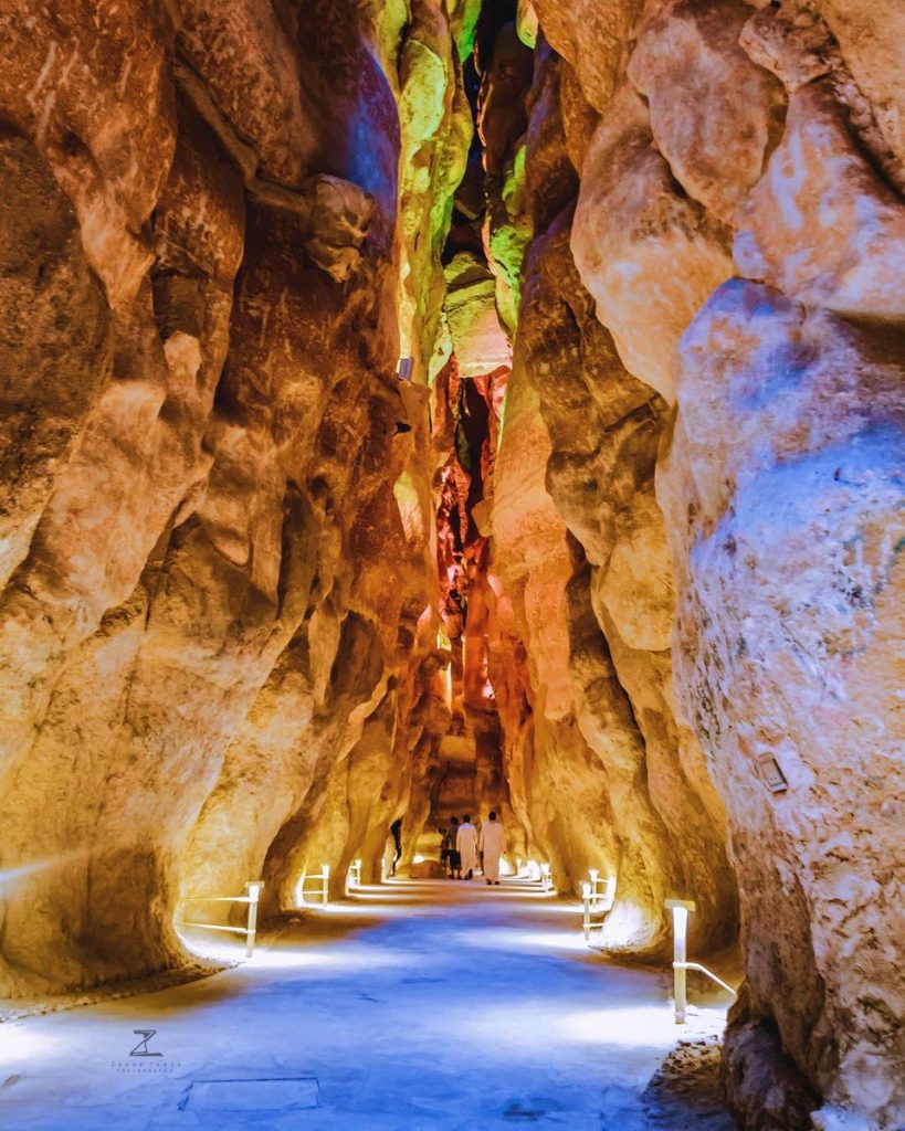ما يترك الزائرين في حالة من الرهبة ليس فقط المنظر من أعلى الجبل، ولكن أيضًا كهوفه الغامضة. والكهوف هي نتيجة لجبل القارة الذي يقع على الحدود الشرقية لهضبة شدقم، ويتصل بالكويت والعراق شمالاً وصحراء الربع الخالي جنوباً. وقد أدى التجوية تحت الجوية، التي تشكلت بفعل الأمطار والأنهار بدلاً من المياه الجوفية، إلى منحنياتها المميزة وكهوفها وأشكالها التي تشبه الفطر. وقد أدت هذه العملية أيضًا إلى إنشاء أودية ضيقة وممرات داخلية طويلة داخل الجبل والتي يجب مشاهدتها.