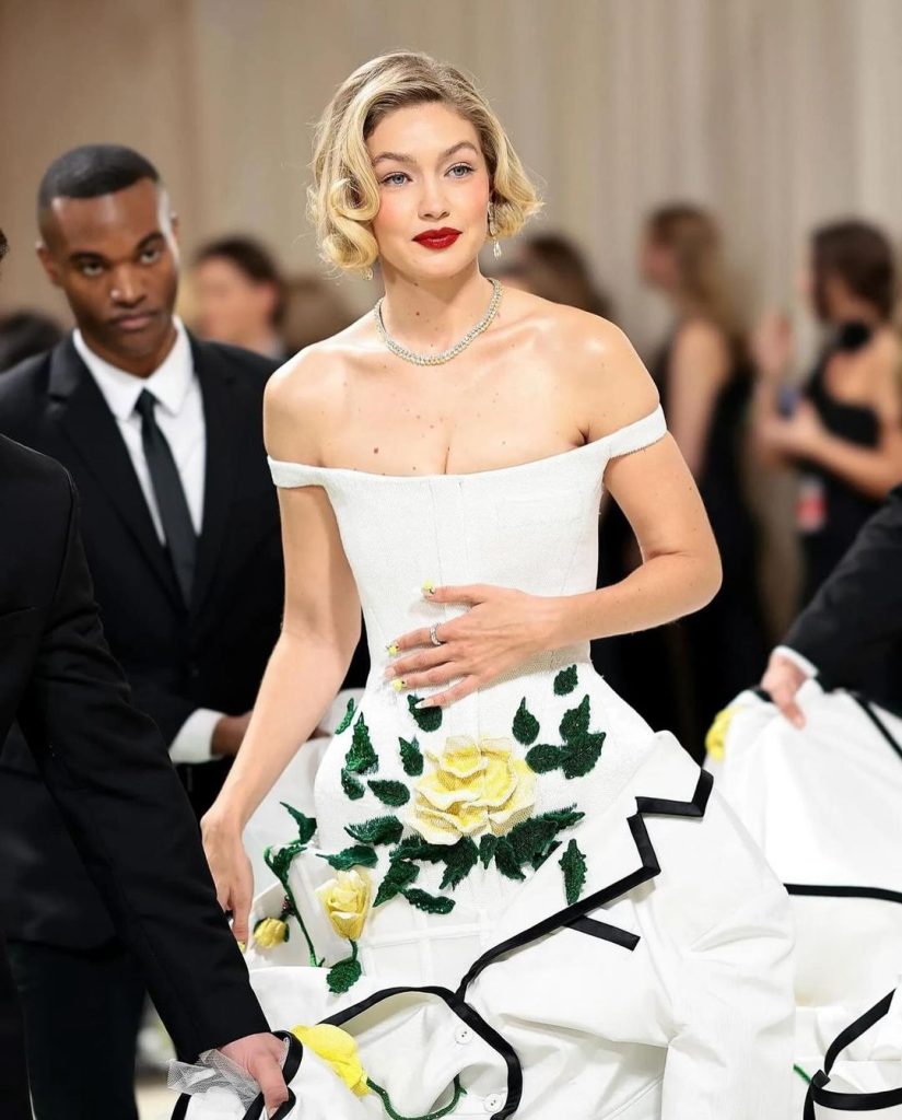 وفي الوقت نفسه، تبنت جيجي حديد الجمالية القديمة لتكريم قواعد اللباس في حفل Met Gala 2024 تحت عنوان “The Garden of Time”. وارتدت عارضة الأزياء فستاناً أبيض مكشوف الكتفين من Thom Browne مع تنورة متدرجة مزينة بأزهار صفراء لتصعد سلالم متحف MET. كذلك يتميز فستانها بخط عنق عميق، وصدرية مشد مع أربطة شريطية مثبتة على الظهر، وقطار جارف على الأرض.
