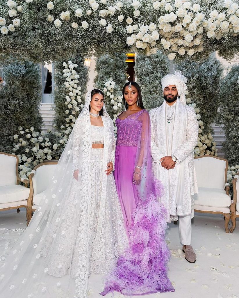حضرت ناعومي كامبل حفل زفاف الملياردير الهندي عمر كماني على عارضة الأزياء ندى أديل مرتدية الساري الخزامي من تصميم المصمم الشهير مانيش مالهوترا.
