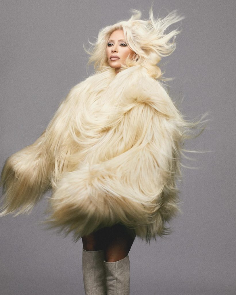 كما أعادت كيم أيضًا السبعينيات من خلال البدلات الكبيرة والأحذية ذات الفراء.