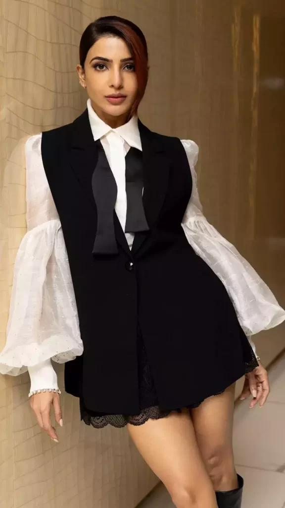 أحدث إطلالة لسمانثا هي تعريف للأناقة. فقد خطفت الأنظار بسترة سوداء فوق فستان أبيض قصير بأكمام منفوخة. وارتدت حذاءً أسود طويلًا من الجلد، لتتألق بإطلالة ساحرة.