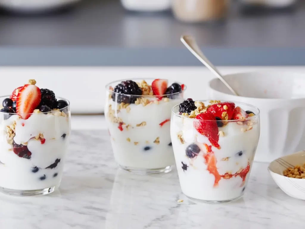 اختاري أصنافًا عادية غير محلاة – ويفضل الزبـادي اليوناني – للحصول على نسبة أعلى من البروتين وكمية أقل من السكر.