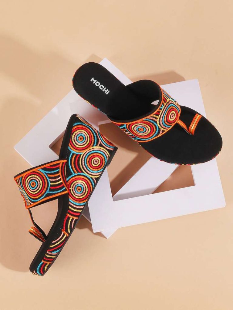 حذاء Mochi Ethnic Embellished One Toe Wedges مثالي للمناسبات العرقية، حيث يتميز بزخارف معقدة وتصميم بأصابع واحدة. يضيف الكعب الإسفيني الأنيق لمسة احتفالية، مما يجعله خيارًا رائعًا للملابس التقليدية.