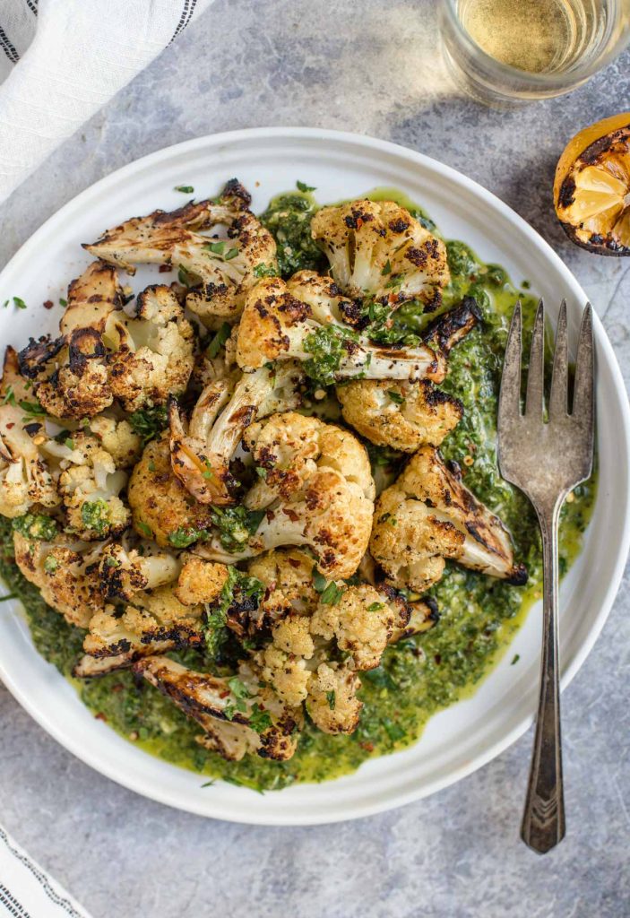 لضمان وصول المحلول الملحي إلى اللب الكثيف، نستخدم سكين تقشير لثقب طرف الساق قبل وضع الرأس في السائل الساخن. بعد إزالته وتجفيفه، يدخل إلى الفرن. وللإنهاء، يدهن خليط من الزبدة والخردل الكامل الحبة على الخضار المملحة قبل تغطيتها بالشبت وفتات الخبز بانكو. ثم تعاد إلى الفرن حتى يتحمر سطحها. كما تتبل كل قطعة من القرنبيط بنكهة لذيذة، ويكتمل قوامها اللحمي الطري بقرمشة فتات الخبز. أيضًا يتم تقطيع القرنبيط إلى أسافين للتقديم، وهو يشكل طبقًا رئيسيًا أو طبقًا جانبيًا نباتيًا رائعًا.