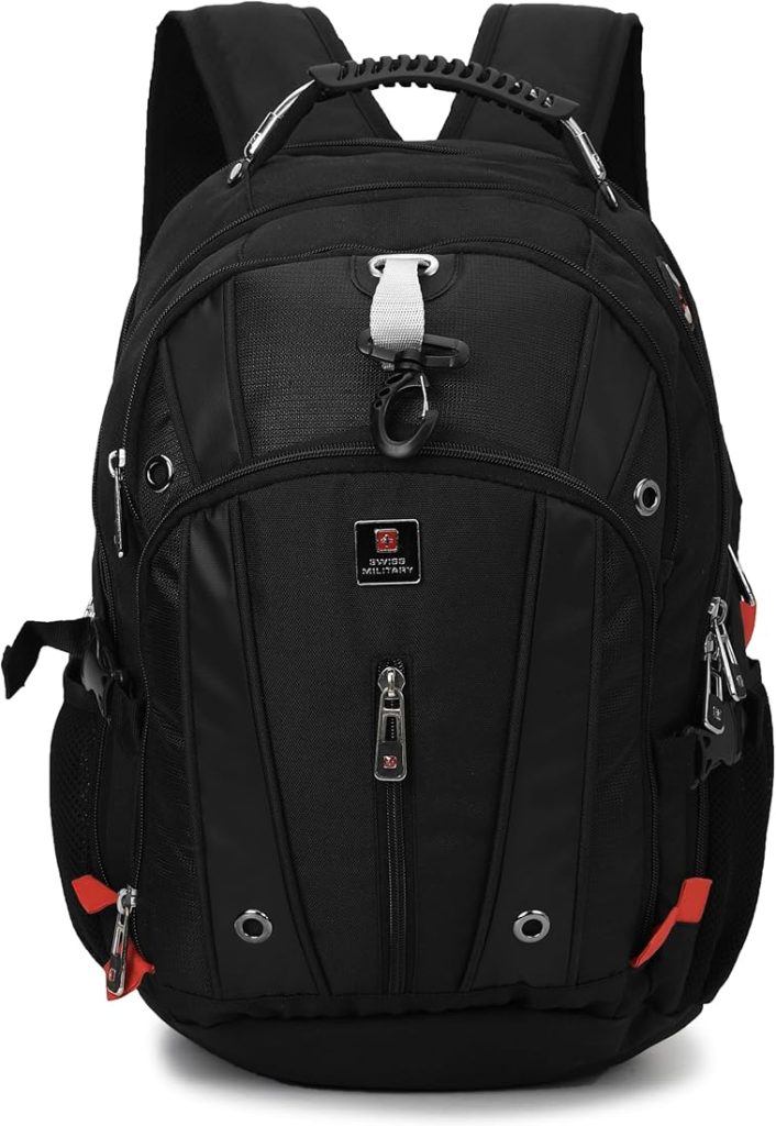حقيبة ظهر سويس ميليتاري للكمبيوتر المحمول: حقيبة مقاومة للماء بسعة 31 لترًا مزودة بمنفذ USB ومنفذ AUX. وظهر من مادة إي في إيه قابلة للتهوية، وحقيبة ظهر أنيقة للسفر والأنشطة الخارجية للرجال والنساء – لون أسود