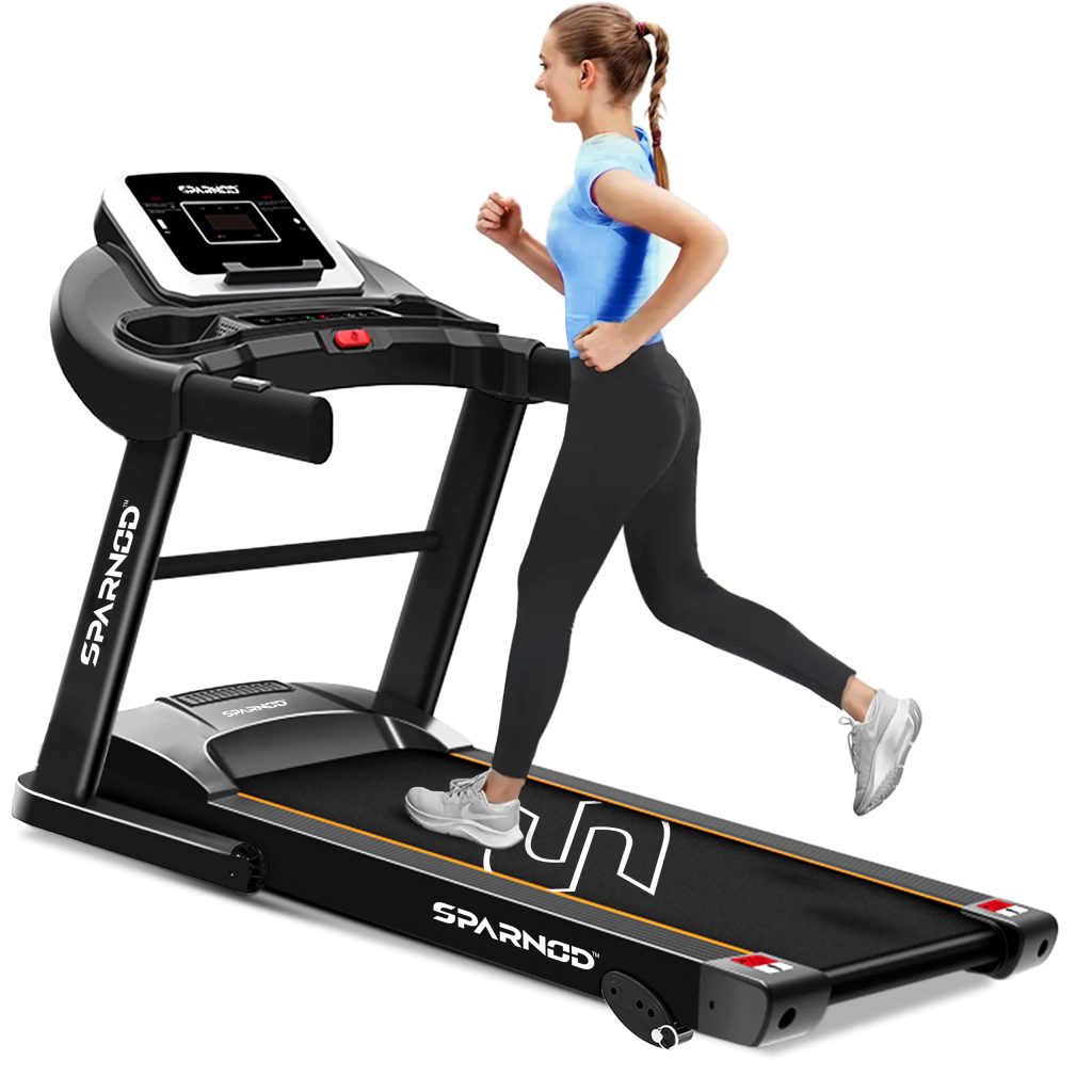 جهاز جري كهربائي Sparnod Fitness STH-1200 للاستخدام المنزلي، محرك تيار مستمر بقوة 4 حصان، سرعة 12 كم/ساعة، أقصى وزن للمستخدم 110 كجم، 12 تمرينًا محددًا مسبقًا، ميل يدوي، مكبر صوت هاي فاي، مفتاح أمان