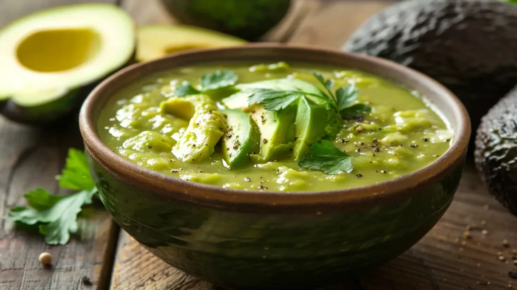 خيار مقشر ومقطع – 1، أفوكادو ناضج – 2، زبادي يوناني عادي – 1 كوب، هالبينو مفروم خشن – 1، بصل أخضر مفروم – 2، كزبرة – 1 كوب معبأ، ملح حسب الرغبة، كمون مطحون – 1/2 ملعقة صغيرة، كزبرة مطحونة – 1/2 ملعقة صغيرة، ماء مثلج – 1/5 كوب، كزبرة وزيت زيتون للتزيين.
