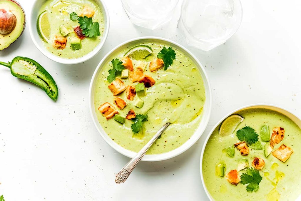 أضيفي الخيار، الأفوكادو، الزبادي اليوناني، الفلفل الحار، البصل الأخضر، عصير الليمون. ثم أضيفي الكزبرة، الملح، الكمون، والكزبرة في الخلاط مع الماء المثلج. أيضًا اخلطي المكونات على سرعة عالية حتى يصبح المزيج ناعمًا. ثم اضبطي الملح واتركيه في الثلاجة لمدة ساعة على الأقل وحتى 24 ساعة قبل التقديم. ثم زيّني الطبق بزيت الزيتون والكزبرة.