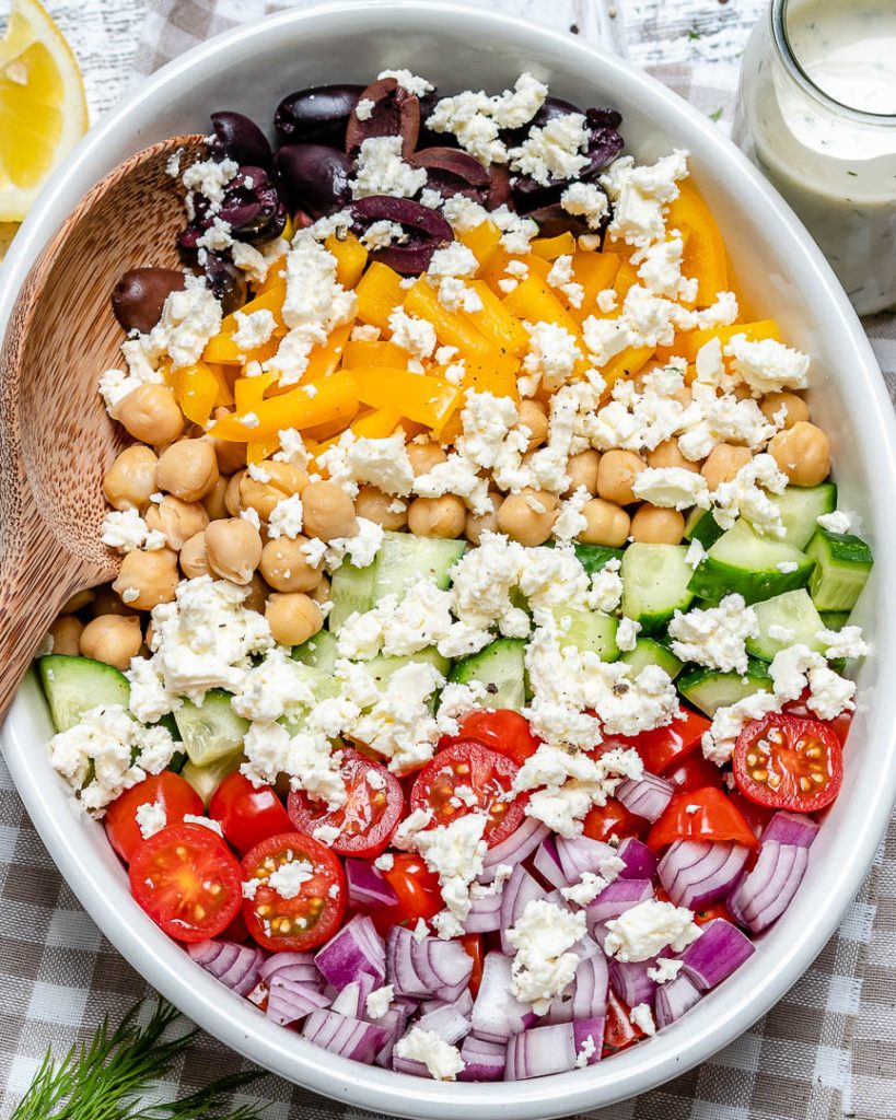 للسلطة: حمص – علبة واحدة، كرفس مفروم ناعم – ¾ كوب، كبر مفروم – ملعقتان كبيرتان.