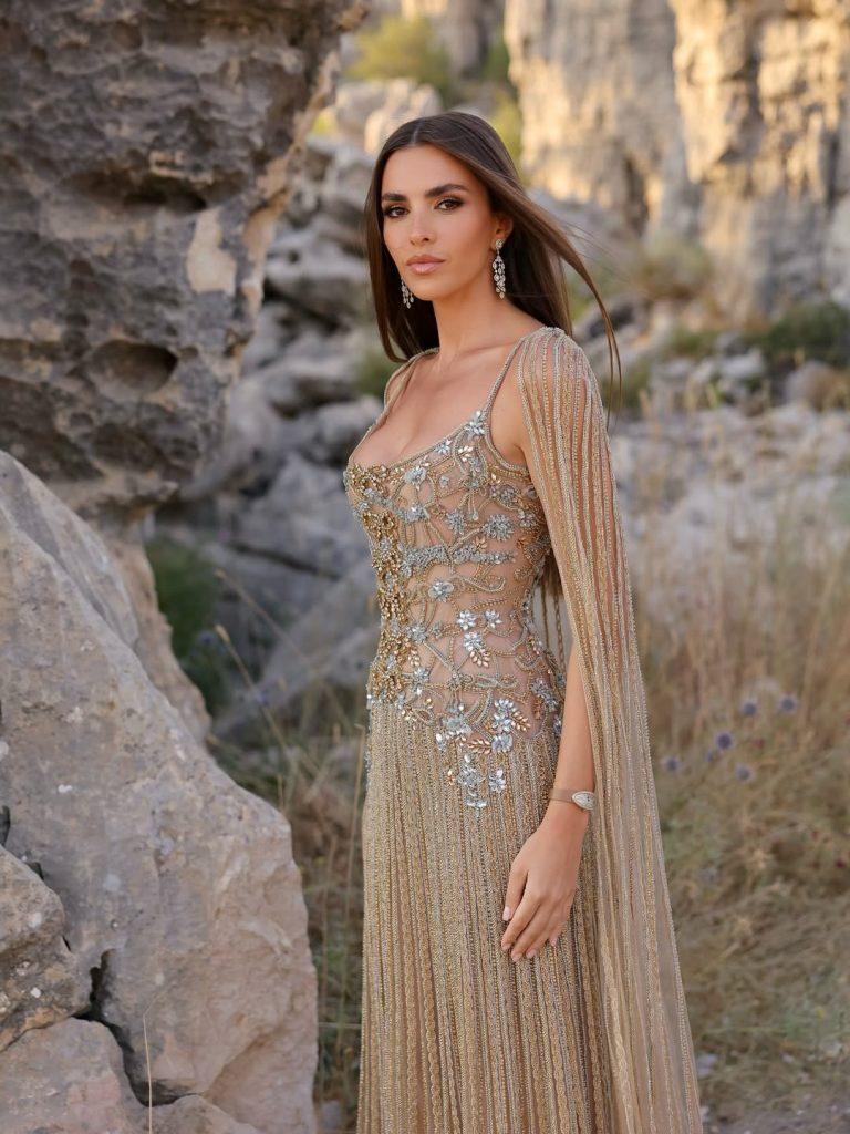 فستان بلون الشمبانيا. مع فتحة صدر على شكل حرف V عميقة وتطريز معدني عمودي، يتميز بتنورة خارجية مثيرة وحجاب طويل متناسق للاحتفال بالزفاف.