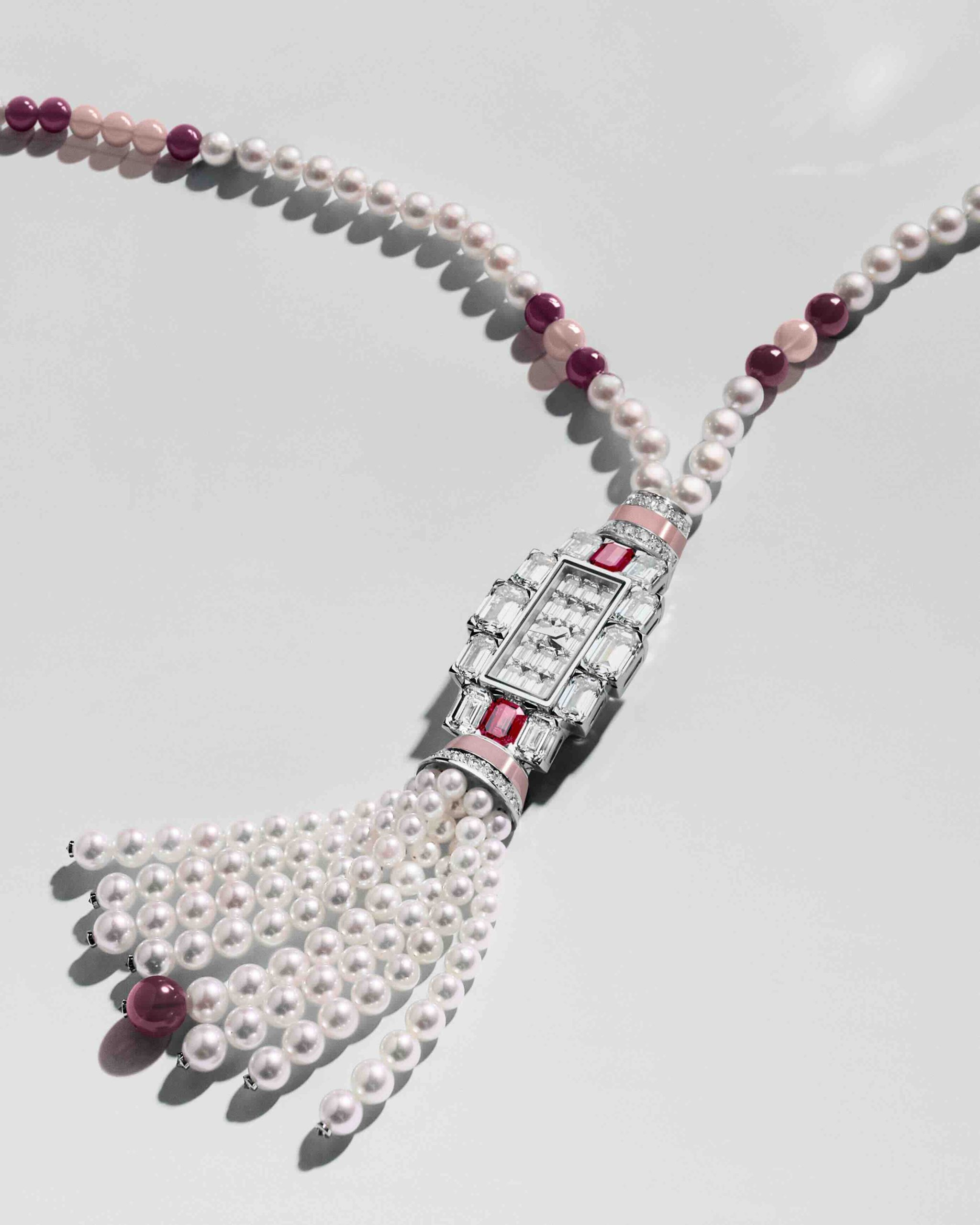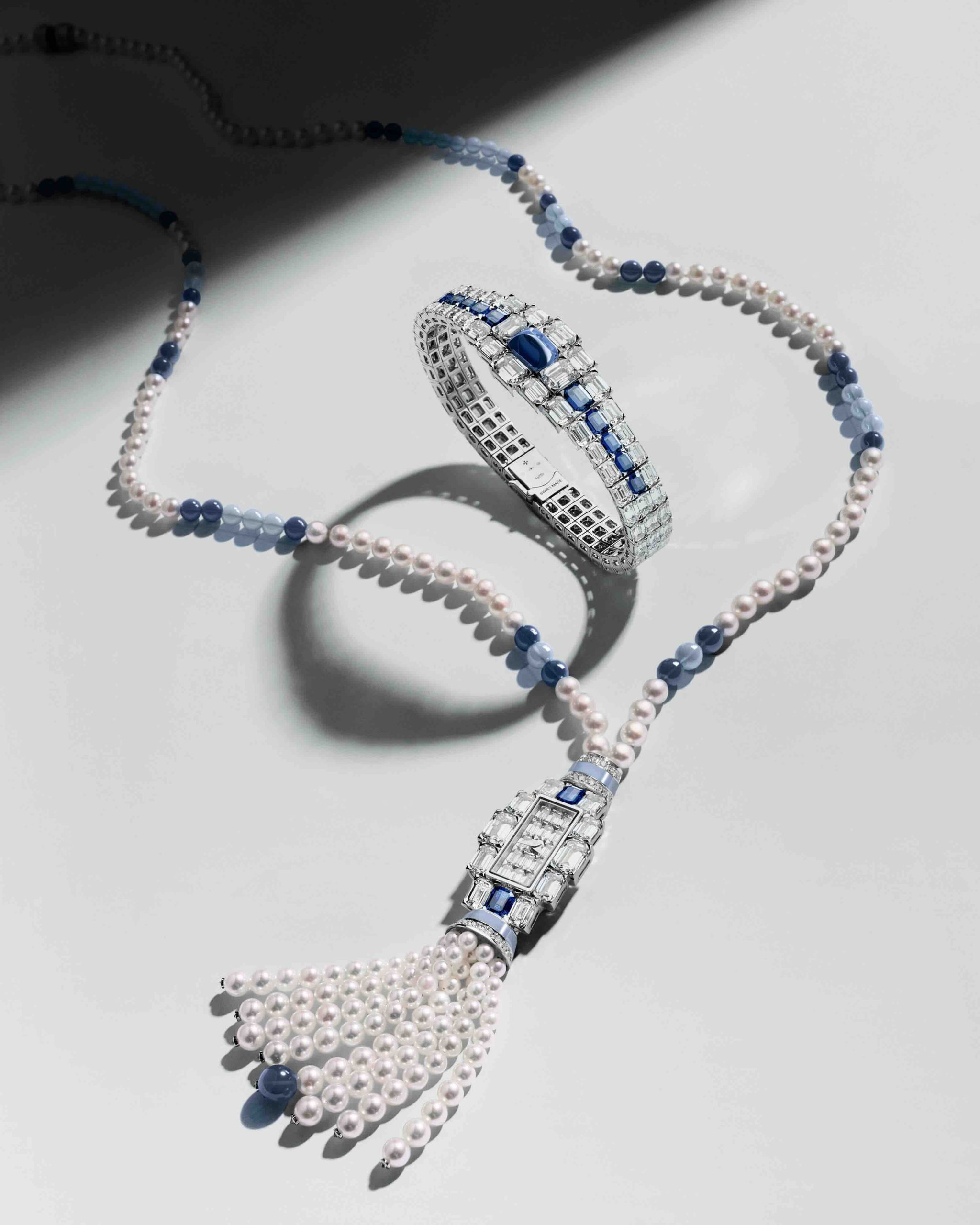 كل ساعة تنقسم إلى أربع تحف قابلة للتبديل: ساعة مرصّعة بالكامل، قطعة مجوهرات آسرة، سوار ريفييرا بثلاث صفوف، وعقد سوتورا طويل – ليصبح الوقت تجربة قابلة للتأويل، تُلبَس كما تشائين.