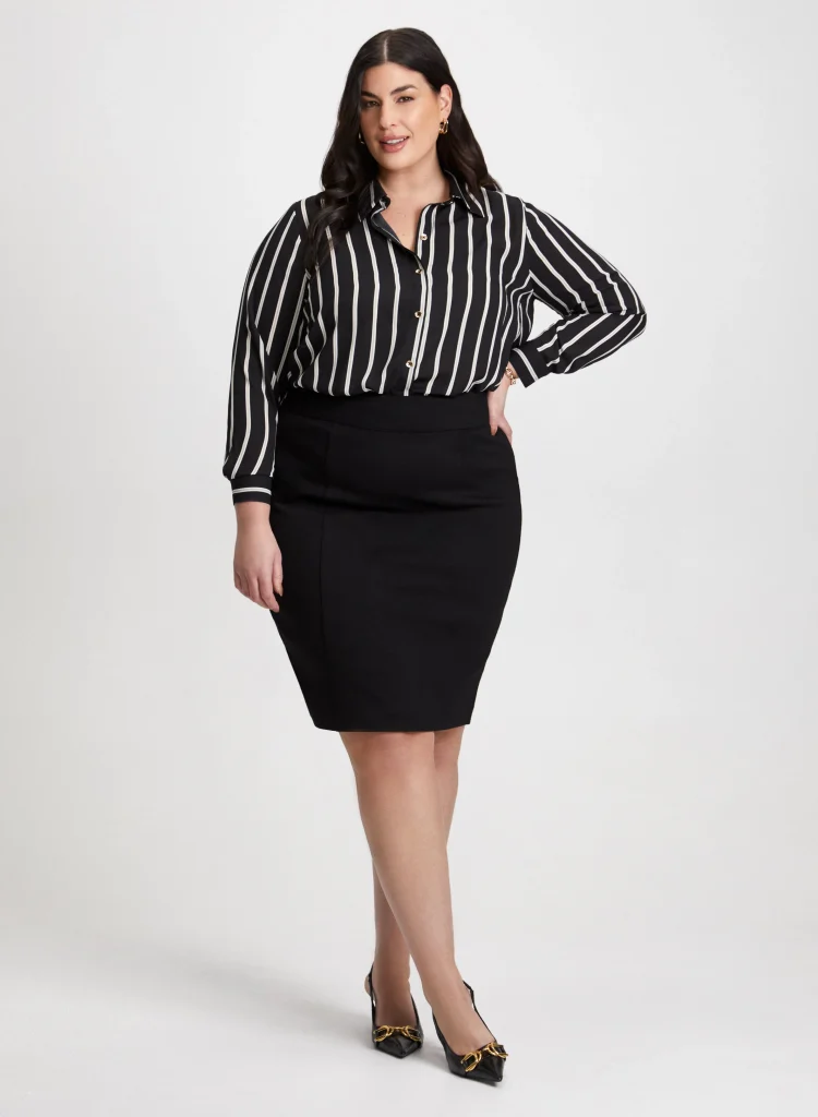 تخيلي تنورة قلم رصاص، لكن اجعليها مرنة ومناسبة للحركة. كما أن هذه التنورة المتوسطة الطول، المستوردة والمطاطية، تحتضنكِ في الأماكن المناسبة وتمنحكِ الراحة طوال اليوم. كذلك مثالية لملابس العمل والمناسبات غير الرسمية، فهي قطعة أساسية في خزانة ملابسكِ، يمكن تنسيقها بسهولة مع إطلالات رسمية أو غير رسمية.