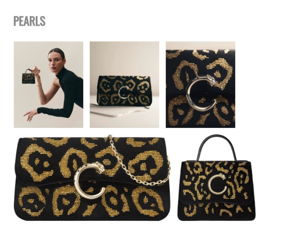 باستخدام اللؤلؤ والترتر والصوف والخيوط اللامعة، تقدّم حقائب “سي دو كارتييه” و”پانتير دو كارتييه” و”پانتير دوبل”تطريزًا بمواد جديدة ومرحة ورقيقة. وتزدان هذه الحقائب الفريدة بزخرفة رُقط الپانتير أو مخالب السنوّري أو توقيع حرف “سي” المزدوج. وتشير هذه الزخارف المطبوعة بشكل ناتئ إلى المشابك الشبيهة بالمجوهرات في هذه الحقائب.