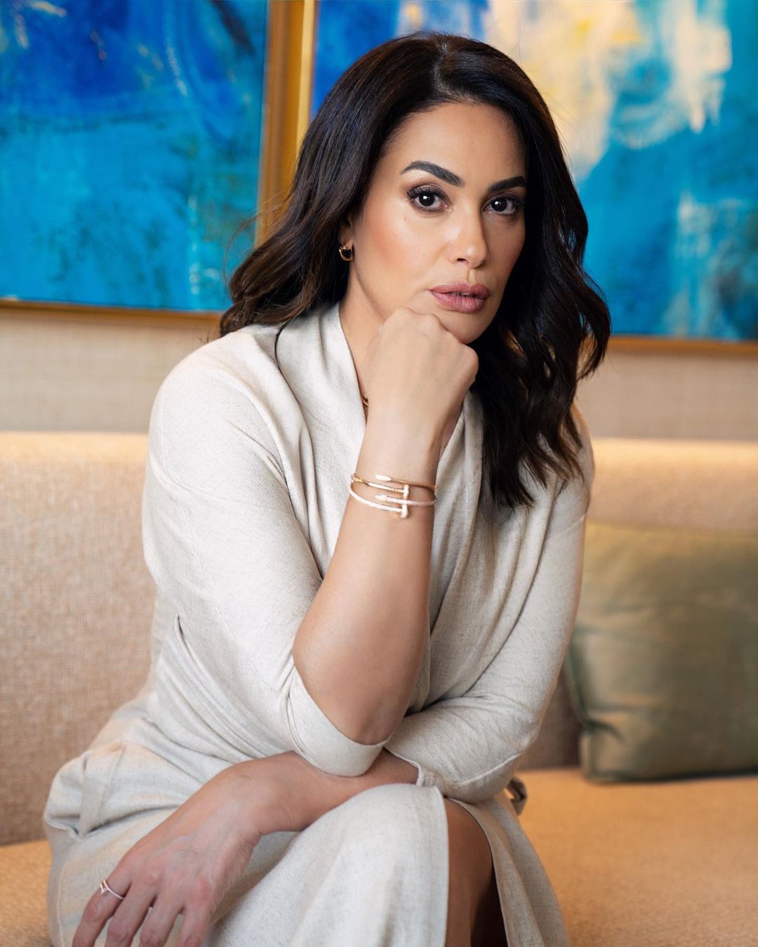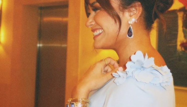 تبرز الفنانة التونسية بإطلالة مترفة، حيث يتدلى العقد بتصميم متشابك من الألماس، يمنح منطقة الصدر وهجاً لافتاً، فيما تتناغم معه الأقراط البراقة، التي تضيف إشراقاً ناعماً للوجه، أما السوار العريض، فيأتي كقطعة بطول معصمها تقريباً، وتتلألأ تفاصيله الدقيقة؛ ليضفي حضوراً قوياً، كما اختارت خاتماً ألماسياً كبير الحجم؛ ليكمل فخامة الإطلالة بلمسة كلاسيكية آسرة.