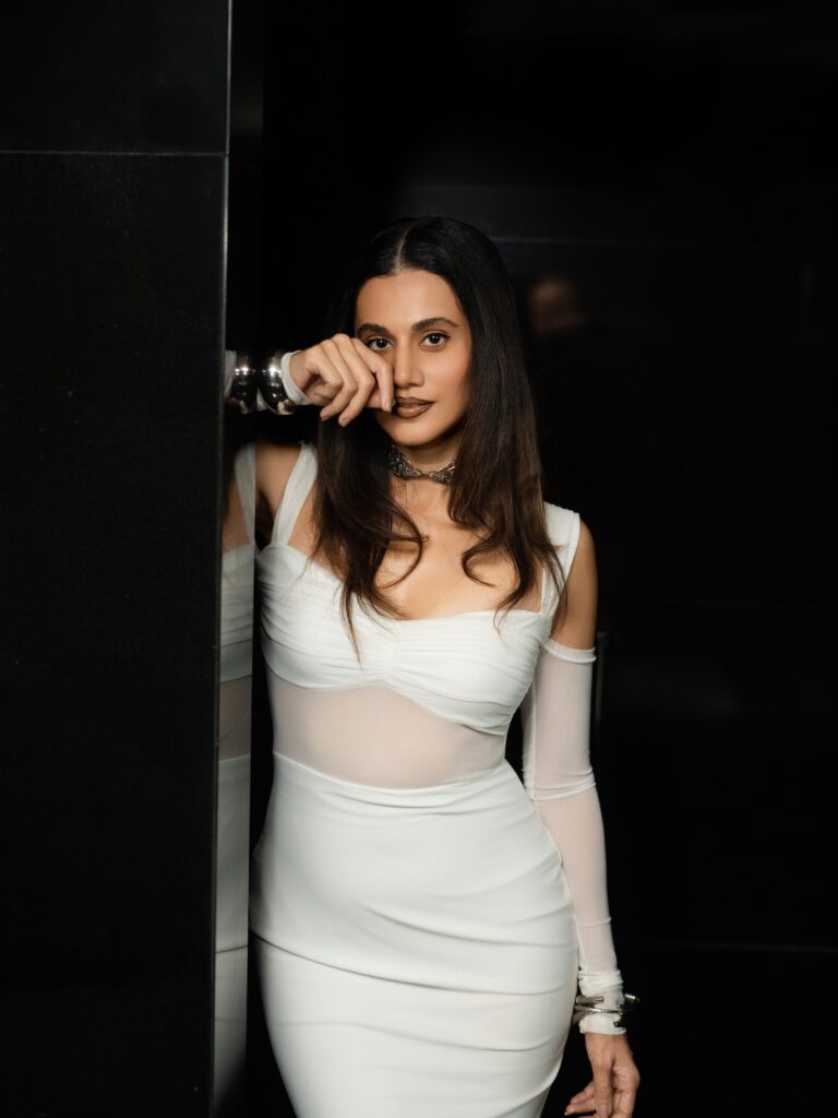 أحدث إطلالة لتابسي بانو بفستان أبيض ولمسة معدنية تلفت الأنظار