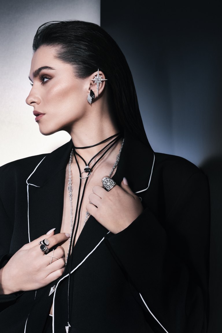تدمج المجموعة ببراعة بين الزخارف الفلكية والأشكال النحتية والمعمارية خالقةً مزيجًا متناغمًا بين القوة والنعومة. تتميز كل قطعة بزوايا حادة ومنحنيات متدفقة وأحجار لامعة تلتقط الضوء وتعكسه مع كل حركة يقوم بها من يرتديها. وتعيد هذه القطع رسم النجوم بالذهب والماس، جامعةً بين الطابعَين العصري والأبدي في آن واحد.