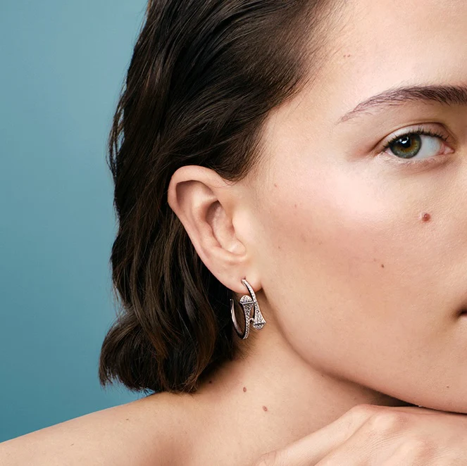 يعتمد هذا التصميم على الخطوط الهندسية النظيفة، التي تشتهر بها الدار، حيث تعانق الدوائر المرصعة بالألماس الأبيض أحجاراً خضراء عميقة، لإطلالة تحاكي روح المدينة التي لا تنام، كخيار مثالي لليلة رأس السنة، وتتوج الأقراط بحجر أخضر بقطع مربع، ليضفي لمسة من «المودرنيزم» الراقية، التي تعكس هوية المرأة الواثقة، والطموحة.
