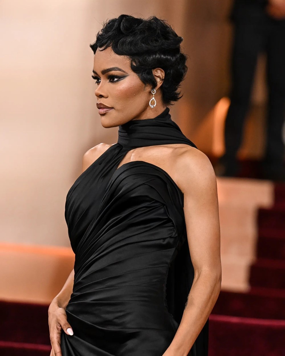 أطلت بفستان أسود، مصمم خصيصاً لها من دار «سكياباريلي»، الذي استحضرت من خلاله سحر هوليوود الكلاسيكية في الأربعينيات والخمسينيات، بالإضافة إلى تسريحة الشعر القصيرة المموجة بأسلوب ناعم، التي أضافت لمسة راقية قديمة أيضاً، وكذلك الإكسسوارات كان لها دور في تعزيز الأسلوب «الفينتاج» في «اللوك»؛ إذ اختارت الأقراط المتدلية المرصعة.