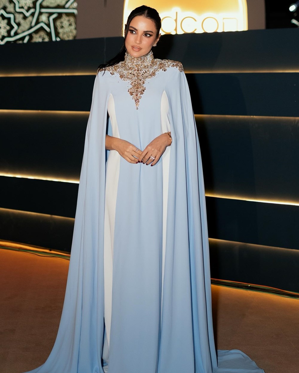 تألقت بفستان طويل باللون الأزرق الملكي، جاء بتصميم واسع وفضفاض ينساب بنعومة، مانحاً حضوراً لافتاً يوازن بين الرقي والراحة، ويبرز التصميم بطبقات القماش المتداخلة، التي تضيف لمسة درامية ناعمة، أما فتحة الصدر الهادئة مع الإكسسوار اللامع عند العنق، فقد أضفت إشراقة محسوبة، تكمل فخامة اللون، ويمكنكِ تنسيق مثل هذه الإطلالة الملكية في السهرات المسائية بشهر رمضان.