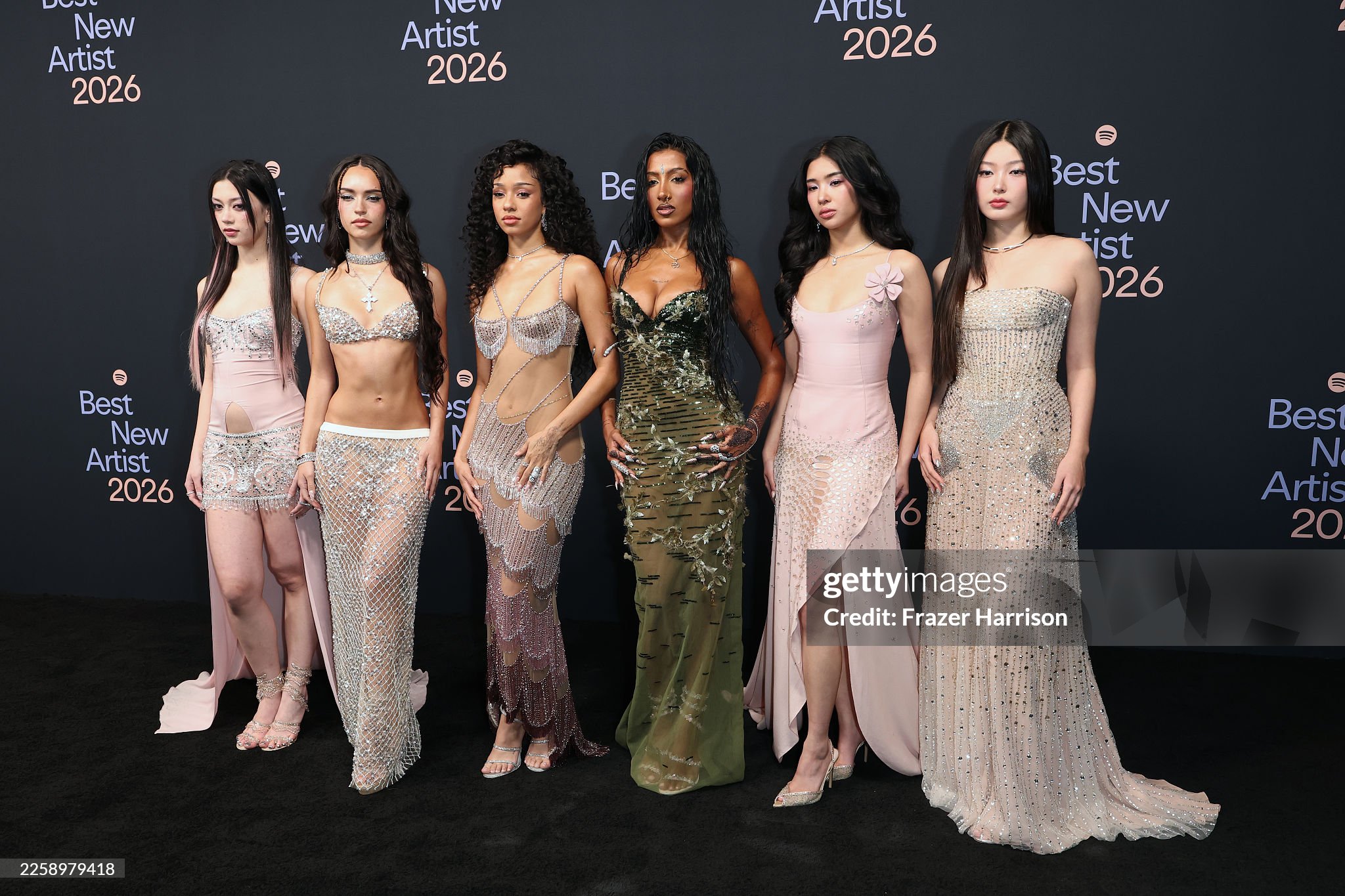 WEST HOLLYWOOD, CALIFORNIA – JANUARY 29: (L-R) Megan Skiendiel, Daniela Avanzini, Manon Bannerman, Lara Raj, Sophia Laforteza and Yoonchae Jeung of Katseye attend 2026 Spotify Best New Artist at The Lot at Formosa on January 29, 2026 in West Hollywood, California. (Photo by Frazer Harrison/WireImage)