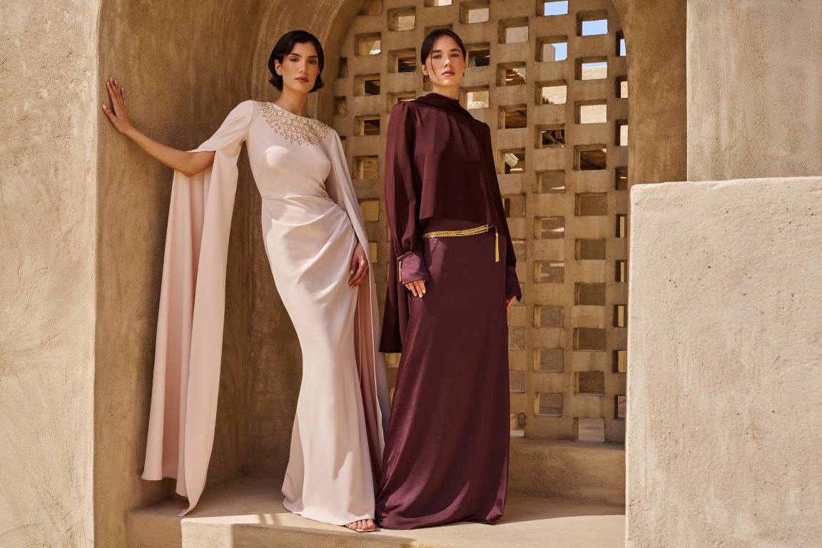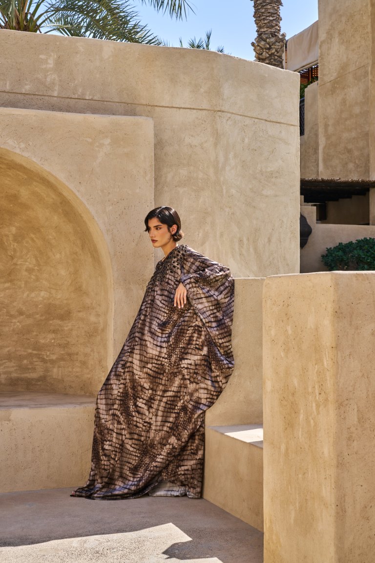 تتألق المجموعة بلوحة ألوان مضيئة؛ تتدرج من الأصفر الزبدي الهادئ وصولاً إلى الأسود العميق، مرورًا بدرجات النيود ولمسات مستوحاة من وهج الشمس. وتتجسد هذه اللوحة في خامات من الكريب دي شين والساتان والجورجيت، والشيفون المختارة بعناية لخفتها وانسيابيتها الفائقة. وتتنوع القطع بين قصات ناعمة وخطوط تحتضن الجسد برقة لتشمل القفاطين والعبايات والأطقم المتناسقة، وفساتين السهرة؛ وكلها تزدان بتطريزات متقنة وتفاصيل تحاكي بريق المجوهرات، ونقوش مستلهمة من الطبيعة، لتؤكد من جديد على براعة الدار الحرفية وتفردها.