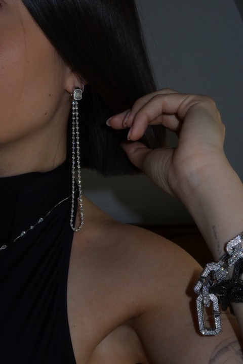 Diamond Eclipse Necklace — عقد “دايموند إكليبس” بتصميم معاد ابتكاره من سلسلة cuban link، حيث يتلألأ كل رابط بالألماس من جميع الزوايا، ليقدّم بريقًا دائريًا بزاوية 360 درجة. يمكن ارتداؤه كعقد أو فصله ليصبح أساور، بتصميم أنيق، وروح الروك ولمسة محايدة للجندرية — رمز حقيقي للتنوّع والمرونة.