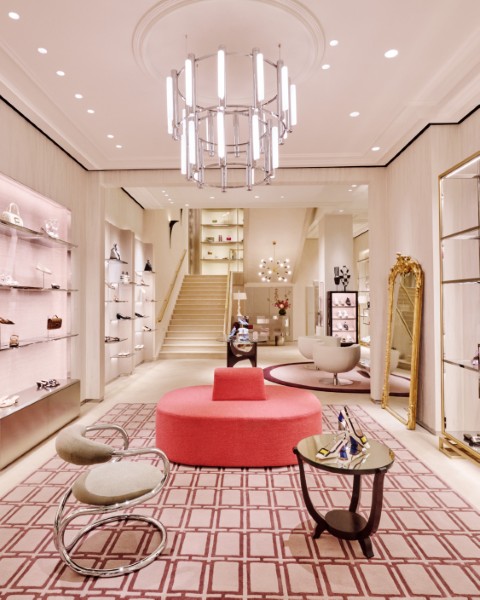 صُمّم هذا المتجر ليكون مساحةً للبيع بالتجزئة وانعكاسًا للغة روجيه ڤيڤييه (Roger Vivier) الجمالية في آنٍ واحد، جامعًا بين الهندسة والتصميم والحِرفية في إطارٍ يوازن بين الدقّة والحضور الحسي. ومنذ اللحظة الأولى، يؤكد الدرجٌ المهيب مع الارضيات من حجر الـ Pierre de la Croix-Huyart هويةً فرنسية واضحة، فيما تتناغم الجدران بتشطيباتٍ كريمية من الجص وعرق اللؤلؤ، التي تم تطويرها حصريًا للدار على يد حرفي من توسكانا، مع ورق الجدران الوردي المصمّم خصيصًا من Pierre Frey داخل مساحات العرض المخصصة، لتُضفي تباينًا رقيقًا في تدرّجات الألوان والملامس..