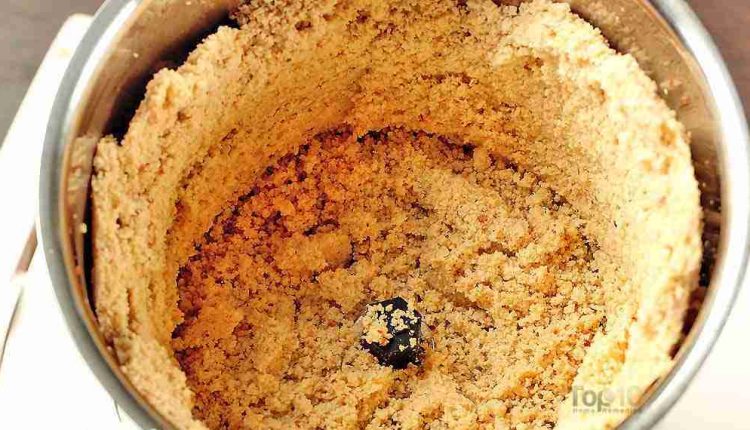 - اطحني الفول السوداني مع التقليب بشكل مستمر حتى يتجانس مع بعضه وتحصلي على مسحوق ناعم.